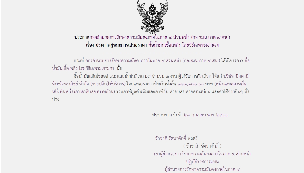 ประกาศผู้ชนะการเสนอราคา ซื้อน้ำมันเชื้อเพลิง โดยวิธีเฉพาะเจาะจง