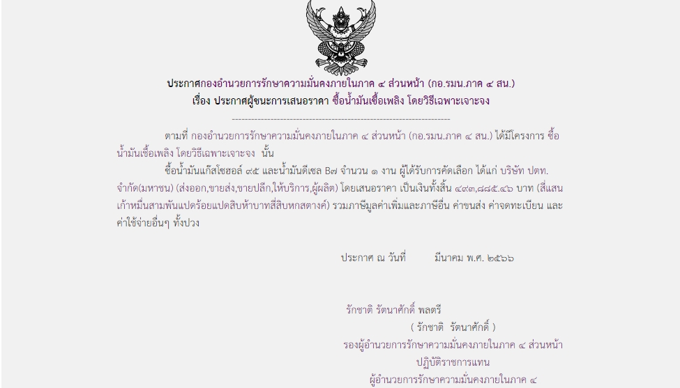 ประกาศผู้ชนะการเสนอราคา ซื้อน้ำมันเชื้อเพลิง โดยวิธีเฉพาะเจาะจง