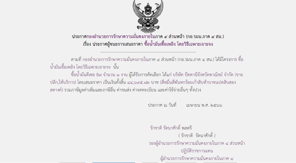 ประกาศผู้ชนะการเสนอราคา ซื้อน้ำมันเชื้อเพลิง โดยวิธีเฉพาะเจาะจง