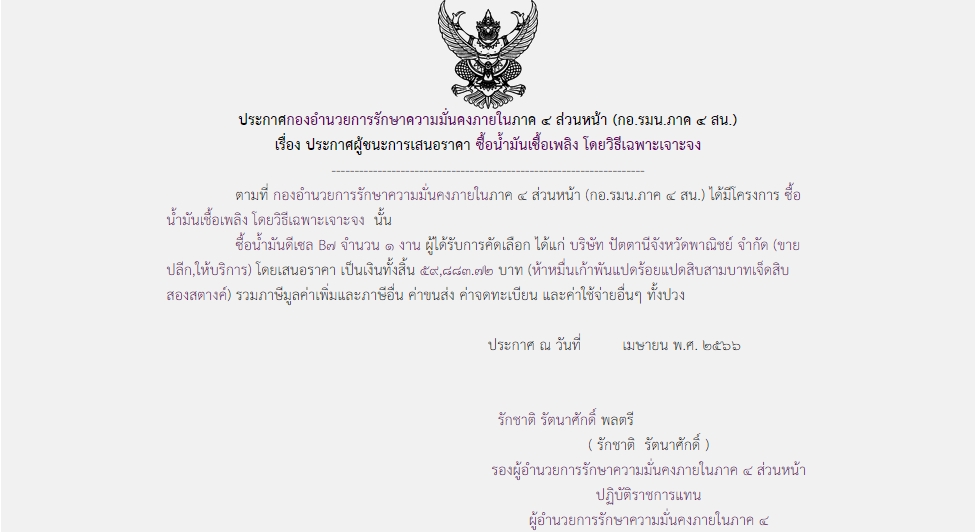 ประกาศผู้ชนะการเสนอราคา ซื้อน้ำมันเชื้อเพลิง โดยวิธีเฉพาะเจาะจง