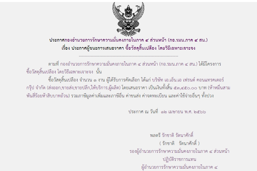 ประกาศผู้ขนะการเสนอราคา ซื้อวัสดุสิ้นเปลือง โดยวิธีเฉพาะเจาะจง