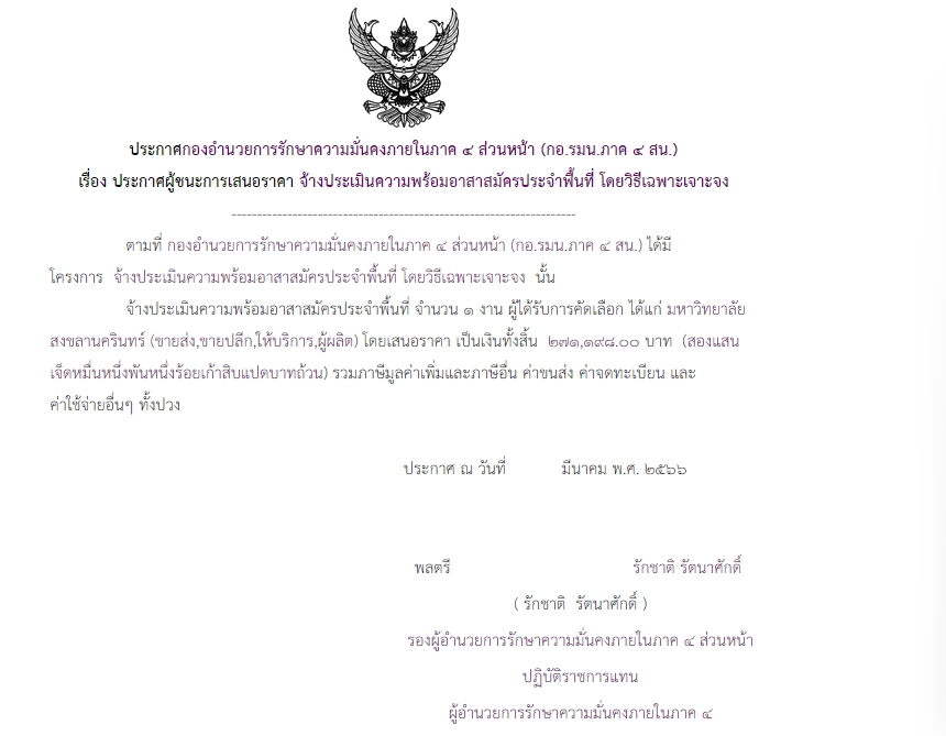 ประกาศผู้ชนะการเสนอราคา จ้างประเมินความพร้อมอาสาสมัครประจำฟื้นที่ โดยวิธีเฉพาะเจาะจง
