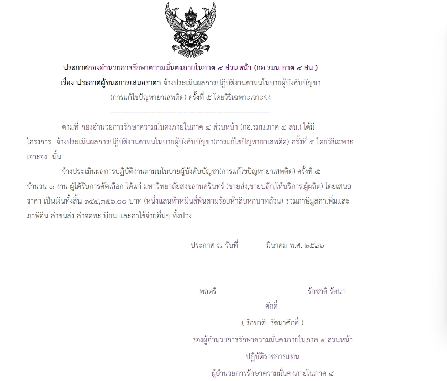 จัดซื้อ จัดจ้างประกาศผู้ชนะการเสนอราคา ประกาศผู้ชนะการเสนอราคา จ้างประเมินผลการปฏิบัติงานตามนโนบายผู้บังคับบัญชา (การแก้ไขปัญหายาเสพติด) ครั้งที่ ๕ โดยวิธีเฉพาะเจาะจง May 3, 2023 335 Share Facebook Twitter Google+ Telegram LINE