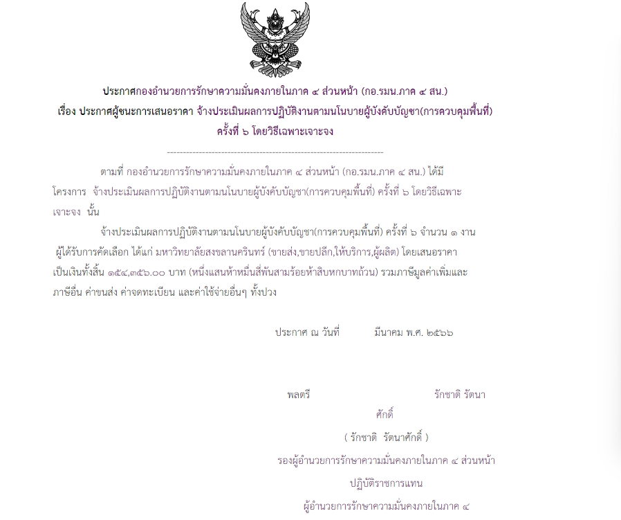 จัดซื้อ จัดจ้างประกาศผู้ชนะการเสนอราคา ประกาศผู้ชนะการเสนอราคา จ้างประเมินผลการปฏิบัติงานตามนโนบายผู้บังคับบัญชา(การควบคุมฟื้นที่) ครั้งที่ ๖ โดยวิธีเฉพาะเจาะจง May 3, 2023 338 Share Facebook Twitter Google+ Telegram LINE