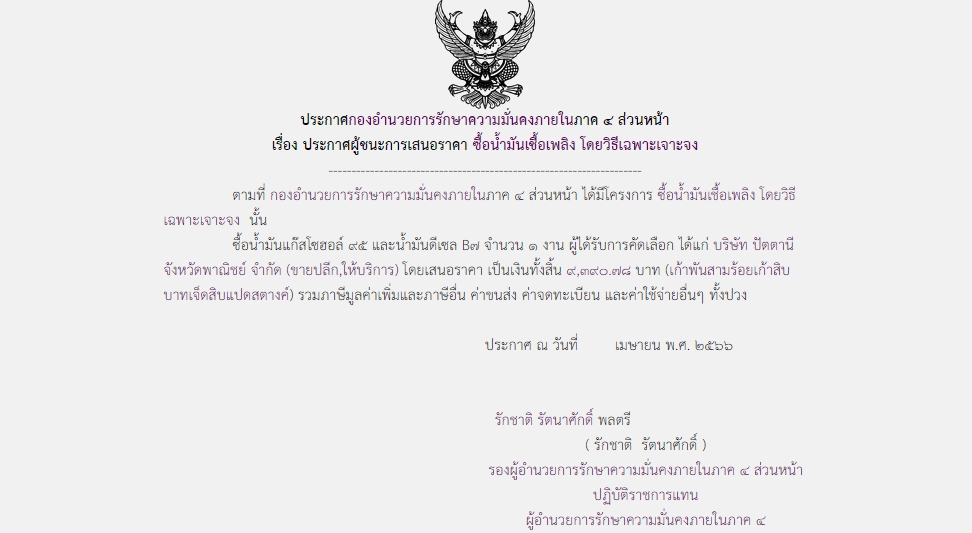 ประกาศผู้ชนะการเสนอราคา ซื้อน้ำมันเชื้อเพลิง โดยวิธีเฉพาะเจาะจง