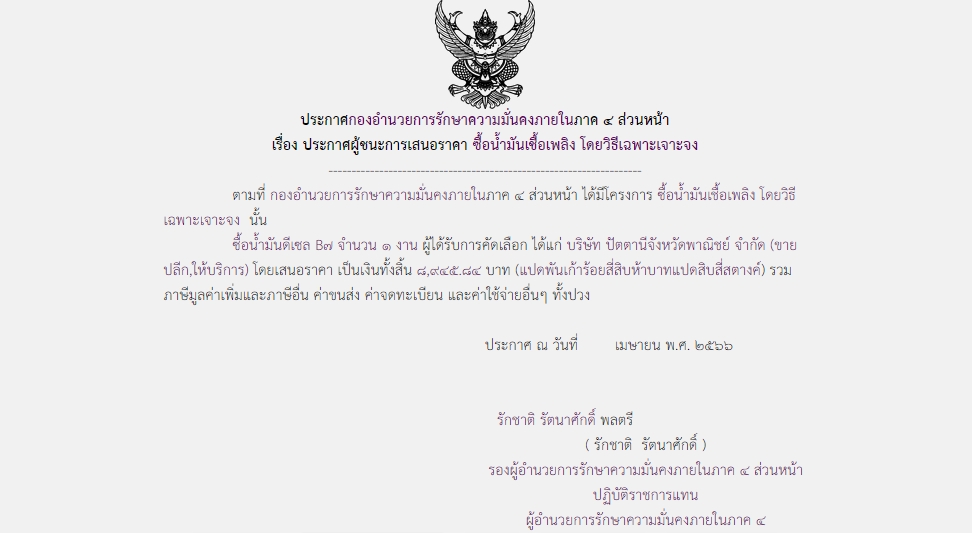 ประกาศผู้ชนะการเสนอราคา ซื้อน้ำมันเชื้อเพลิง โดยวิธีเฉพาะเจาะจง