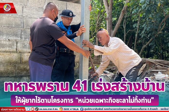 เมื่อวันที่ 6 พฤษภาคม 2566 เวลา 10.30 น. ที่ บ้านเลขที่ 4/1 บ้านกือเม็ง หมู่ที่ 1 ตำบลอาซ่อง อำเภอรามัน จังหวัดยะลา หน่วยเฉพาะกิจกรมทหารพรานที่ 41 จัดกำลังพลชุดปฏิบัติการเสริมสร้างความเข้าใจ กองร้อยทหารพรานที่ 4110 พร้อมด้วยชุดช่างประจำกองร้อย ดำเนินการสร้างที่พักอาศัยภายใต้โครงการ “หน่วยเฉพาะกิจยะลา ไม่ทิ้งท่าน” ให้กับครอบครัวของ นางแยนะ เจะแต และครอบครัว ผู้ยากไร้ในพื้นที่ และเป็นผู้ที่ควรได้รับความช่วยเหลืออย่างเร่งด่วน อีกทั้งยังเป็นการช่วยเหลือบรรเทาความเดือดร้อนให้กับพี่น้องประชาชน