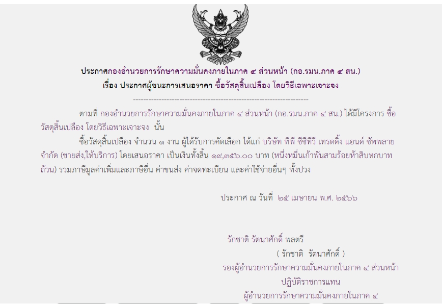 ประกาศผู้ชนะการเสนอราคา ซื้อวัสตุสิ้นเปลือง โดยวิธีเฉพาะเจาะจง