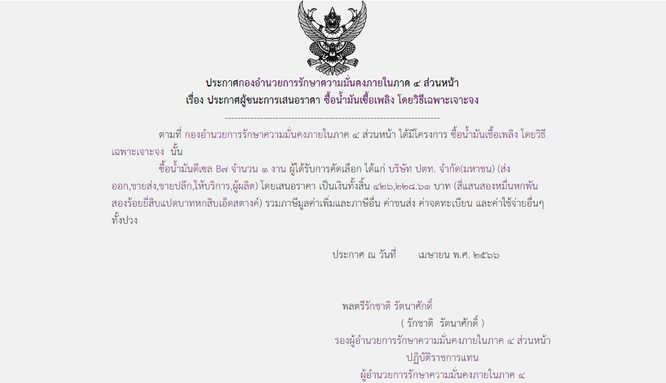 ประกาศผู้ชนะการเสนอราคา ซื้อน้ำมันเชื้อเพลิง โดยวิธีเฉพาะเจาะจง