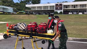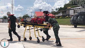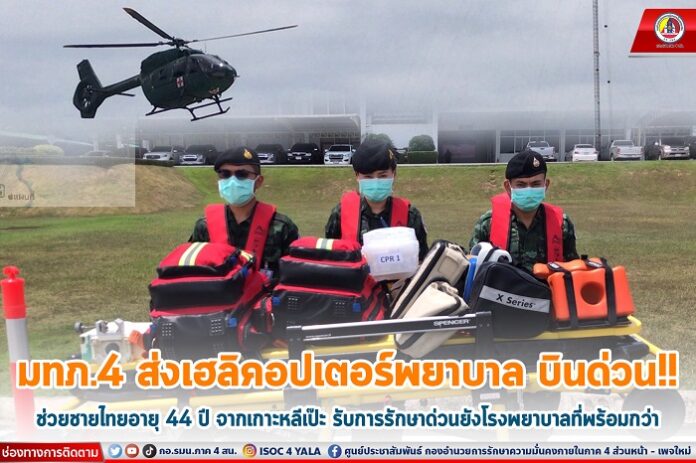 กองอำนวยการรักษาความมั่นคงภายในภาค 4 ส่วนหน้าได้รับการประสานจากแพทย์ โรงพยาบาลส่งเสริมสุขภาพตำบลเกาะหลีเป๊ะ และสถาบันการแพทย์ฉุกเฉินแห่งชาติ ผ่านแพทย์ใหญ่กองทัพภาคที่ 4/ ผู้อำนวยการศูนย์ประสานการแพทย์จังหวัดชายแดนภาคใต้ ขอรับการสนับสนุนการลำเลียงผู้ป่วยด้วยเฮลิคอปเตอร์พยาบาล (ฮ.ท.145 ) ของกองพันบินที่ 41 กรมบิน ศูนย์การบินทหารบก โดยกองทัพภาคที่ 4 เพื่อช่วยเหลือผู้ป่วยเพศชาย อายุ 44 ปี ซึ่งประสบอุบัติเหตุตกจากรถ MC พ่วงข้าง สูงประมาณ 2 เมตร แล้วโดนรถ MC พ่วงข้างเหยียบซ้ำ ทำให้ปวดบริเวณชายโครงด้านขวา และต้องได้รับรักษาด่วน ที่โรงพยาบาลสตูล อำเภอเมืองสตูล จังหวัดสตูล ภายหลังได้รับการประสาน พลโท ศานติ ศกุนตนาค แม่ทัพภาคที่ 4 ผู้อำนวยการรักษาความมั่นคงภายในภาค 4 ได้มอบหมายให้ส่วนที่เกี่ยวข้องใช้เฮลิคอปเตอร์พยาบาล ( ฮ.ท.145 ) ดำเนินการลำเลียงผู้ป่วยเป็นการด่วน ปัจจุบันคนไข้รายดังกล่าว อยู่ระหว่างการรักษา