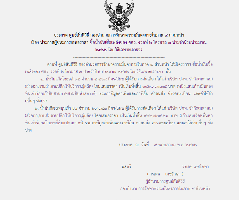 จัดซื้อ จัดจ้างประกาศผู้ชนะการเสนอราคา ประกาศผู้ชนะการเสนอราคา ซื้อน้ำมันเชื้อเพลิงของ ศสว. งวดที่ ๒ ไตรมาส ๓ ประจำปีงบประมาณ ๒๕๖๖ โดยวิธีเฉพาะเจาะจง May 10, 2023 368 Share Facebook Twitter Google+ Telegram LINE