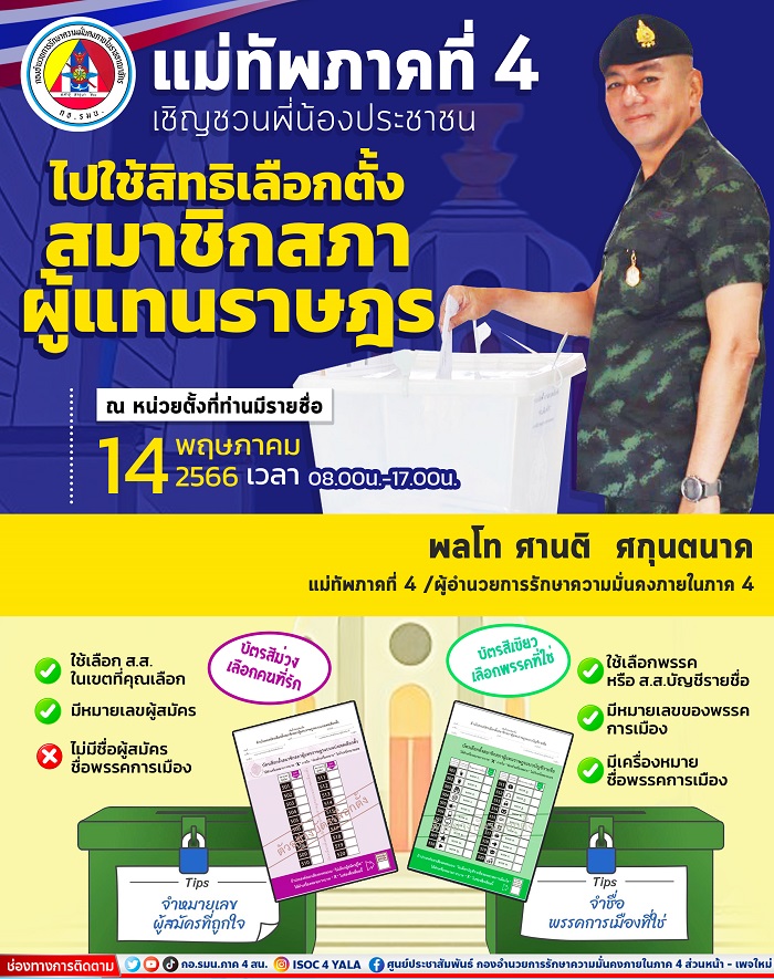 ประชาสัมพันธ์ข่าวประชาสัมพันธ์ “แม่ทัพภาคที่ 4 เชิญชวนพี่น้องประชาชน ไปใช้สิทธิเลือกตั้งสมาชิกสภาผู้แทนราษฎร ณ หน่วยตั้งที่ท่านมีรายชื่อ 14 พฤษภาคม 2566 เวลา 08.00 น. – 17.00 น.” May 11, 2023 656 Share Facebook Twitter Google+ Telegram LINE พลโท ศานติ ศกุนตนาค แม่ทัพภาคที่ 4 /ผู้อำนวยการรักษาความมั่นคงภายในภาค 4 ศูนย์ประชาสัมพันธ์กองอำนวยการรักษาความมั่นคงภายในภาค4ส่วนหน้า