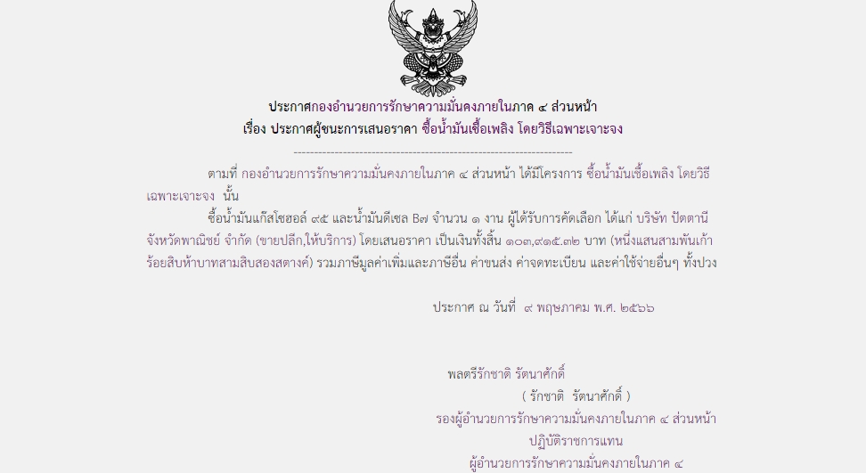 ประกาศผู้ชนะการเสนอราคา ซื้อน้ำมันเชื้อเพลิง โดยวิธีเฉพาะเจาะจง