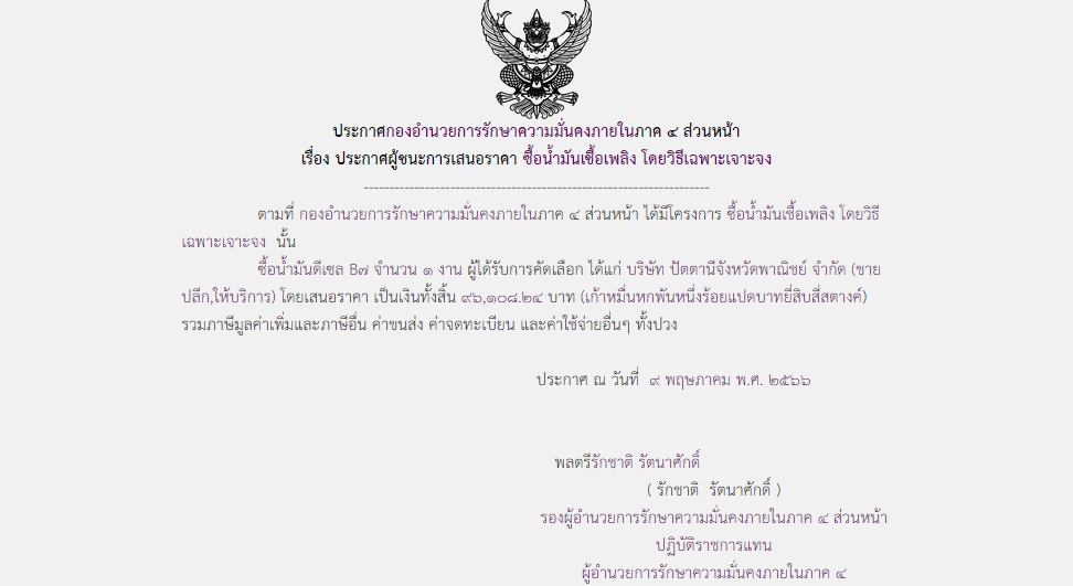 ประกาศผู้ชนะการเสนอราคา ซื้อน้ำมันเชื้อเพลิง โดยวิธีเฉพาะเจาะจง