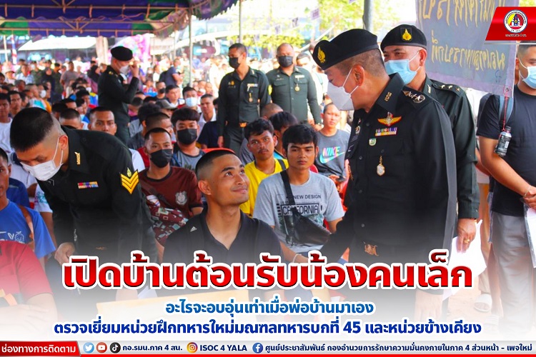 ขณะที่ด้านหน่วยฝึกทหารใหม่ เปิดโอกาสให้พ่อ แม่ ผู้ปกครองและญาติ ๆ เข้าชมสถานที่กินอยู่หลับนอนเพื่อให้เกิดความอบอุ่นใจ สบายใจต่อครอบครัว โดยญาติทหารใหม่ทุกคน บอกเป็นเสียงเดียวกันว่า มีความรู้สึกสบายใจที่หน่วยทหารได้ต้อนรับพ่อ แม่ ผู้ปกครองและญาติของลูก ๆ (ทหารใหม่) เป็นอย่างดี ยิ่งสบายใจขึ้นเมื่อทราบว่าแม่ทัพภาคที่ 4 ให้ความสำคัญ มาตรวจเยี่ยมดูแลความเรียบร้อยด้วยตัวเอง ขอฝากดูแลลูก ๆ ของตนเองต่อให้เหมือนเป็นครอบครัวเดียวกัน