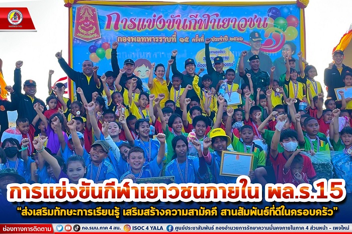 พลตรี เฉลิมพร ขำเขียว ผู้บัญชาการกองพลทหารราบที่ 15 พร้อมด้วย คุณสมฤดี ขำเขียว ประธานสมาคมแม่บ้านทหารบก สาขา กองพลทหารราบที่ 15 เป็นประธานในพิธีเปิดการแข่งขันกีฬาเยาวชน กองพลทหารราบที่15 ครั้งที่ 1 ประจำปี 2566 ณ ลานพื้นแข็งกองพลทหารราบที่ 15 ค่ายสมเด็จพระสุริโยทัย ตำบลบ่อทอง อำเภอหนองจิก จังหวัดปัตตานี เพื่อส่งเสริมทักษะการเรียนรู้ เสริมสร้างความสามัคคี สานสัมพันธ์ที่ดีในครอบครัวให้กับบุตรหลานกำลังพลในห้วงปิดภาคเรียน โดยมี พันเอก ณรงค์ ตันติสิทธิพร รองผู้บัญชาการกองพลทหารราบที่ 15 ตลอดจนผู้บังคับหน่วยขึ้นตรงกองพลทหารราบที่ 15 สมาชิกสมาคมแม่บ้านทหารบก สาขา กองพลทหารราบที่ 15 ตลอดจนบุตรหลานกำลังพลเข้าร่วมกิจกรรมโดยพร้อมเพรียง