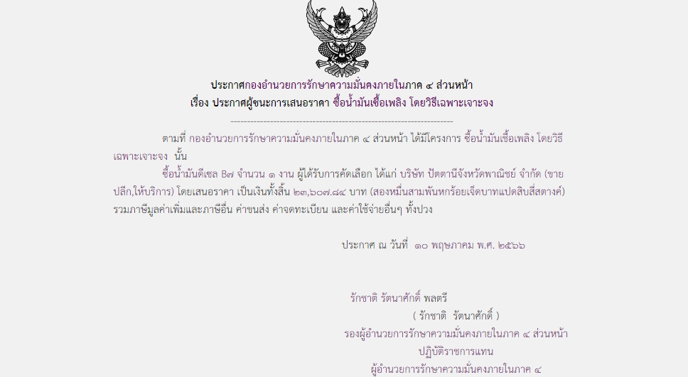 ประกาศผู้ชนะการเสนอราคา ซื้อน้ำมันเชื้อเพลิง โดยวิธีเฉพาะเจาะจง