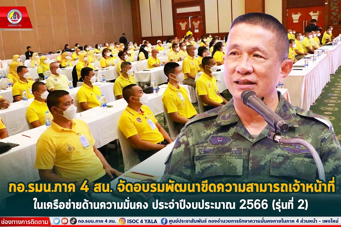 วันนี้ (17 พฤษภาคม 2566) เวลา 11.30 น. ณ โรงแรมบีพีสมิหลาบีช ตำบลบ่อยาง อำเภอเมือง จังหวัดสงขลา พลตรี ปราโมทย์ พรหมอินทร์ รองแม่ทัพภาคที่ 4/ รองผู้อำนวยการรักษาความมั่นคงภายในภาค 4 ส่วนหน้า เป็นประธานพิธีเปิดการอบรมพัฒนาขีดความสามารถเจ้าหน้าที่ในเครือข่ายด้านความมั่นคง ประจำปีงบประมาณ 2566 (รุ่นที่ 2) จัดขึ้นโดยสำนักสารสนเทศ กองอำนวยการรักษาความมั่นคงภายในภาค 4 ส่วนหน้า ในระหว่างวันที่ 17-19 พฤษภาคม 2566 เพื่อสร้างความตระหนักรู้ในสื่อโซเชี่ยลมีเดียอันนำไปสู่การสร้างการรับรู้ สร้างความเข้าใจที่ถูกต้องแก่ประชาชนได้อย่างมีประสิทธิภาพ โดยมี เจ้าหน้าที่เครือข่ายด้านความมั่นคง ตลอดจนโฆษกชาวบ้านในพื้นที่ เข้ารับการฝึกอบรม