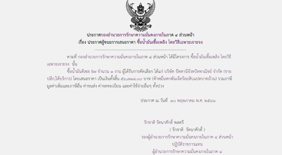 ประกาศผู้ชนะการเสนอราคา ซื้อน้ำมันเชื้อเพลิง โดยวิธีเฉพาะเจาะจง