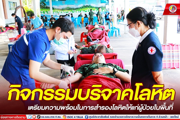 สำหรับกิจกรรมบริจาคโลหิต เพื่อถวายเป็นพระราชกุศลแด่ พระบาทสมเด็จพระบรมชนกาธิเบศร มหาภูมิพลอดุลยเดชมหาราช บรมนาถบพิตร ศูนย์สนับสนุน กองอำนวยการรักษาความมั่นคงภายในภาค 4 ส่วนหน้า ได้ร่วมกิจกรรมมาแล้ว จำนวน 20 ครั้ง ระยะเวลา 3 เดือน/ครั้ง โดยเหล่ากาชาดจังหวัดยะลา ร่วมกับธนาคารเลือด โรงพยาบาลศูนย์ยะลา เป็นผู้ดำเนินการ ซึ่งโลหิตที่ได้นั้นจะนำไปเตรียมความพร้อมในการสำรองโลหิตให้แก่ผู้ป่วยด้วยโรคต่างๆ ที่จำเป็นต้องได้รับโลหิตในการรักษาจำนวนมากต่อไป