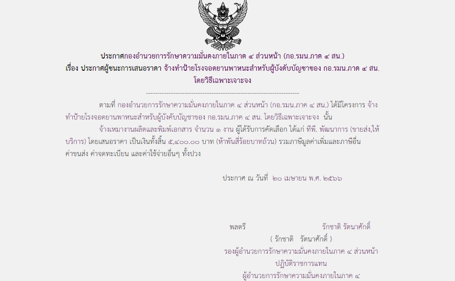 จัดซื้อ จัดจ้างประกาศผู้ชนะการเสนอราคา ประกาศผู้ชนะการเสนอราคา จ้างจัดทำป้ายโรงจอดยานพาหนะสำหรับผู้บังคับบัญชาของ กอ.รมน.ภาค ๔ สน. โดยวิธีเฉพาะเจาะจง May 19, 2023 397 Share Facebook Twitter Google+ Telegram LINE