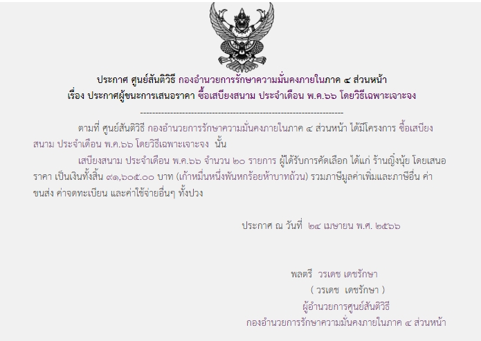 ประกาศผู้ชนะการเสนอราคา ซื้อเสบียงสนาม ประจำเดือน พ.ค.๖๖ โดยวิธีเฉพาะเจาะจง