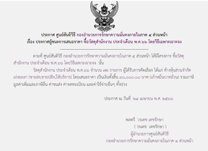 จัดซื้อ จัดจ้างประกาศผู้ชนะการเสนอราคา ประกาศผู้ชนะการเสนอราคา ซื้อวัสดุสำนักงาน ประจำเดือน พ.ค.๖๖ โดยวิธีเฉพาะเจาะจง May 19, 2023 344 Share Facebook Twitter Google+ Telegram LINE