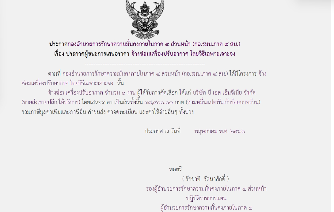 ประกาศผู้ชนะการเสนอราคา จ้างซ่อมเครื่องปรับอากาศ โดยวิธีเฉพาะเจาะจง