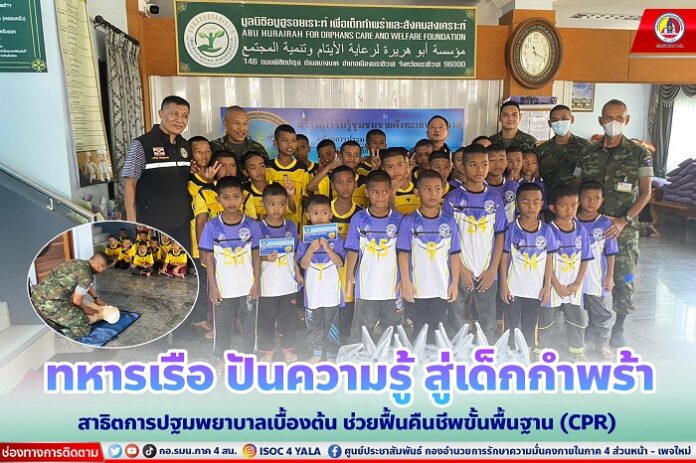 เมื่อวันที่ 21 พฤษภาคม 2566 เวลา 10.00 น. ที่สำนักงานมูลนิธิ ตำบลบางนาค อำเภอเมือง จังหวัดนราธิวาส หน่วยเฉพาะกิจนาวิกโยธินกองทัพเรือที่ 33 พร้อมด้วย เจ้าหน้าที่พยาบาล และเจ้าหน้าที่ศูนย์อำนวยการรักษาผลประโยชน์ของชาติทางทะเล (ศรชล.) ได้ลงพื้นที่จัดกิจกรรม สร้างการรับรู้ ด้านการช่วยเหลือผู้ประสบภัย “สาธิตการใช้เครื่องกระตุกหัวใจ AED และการปฐมพยาบาลเบื้องต้น CPR” โดยวิทยากรเจ้าหน้าที่พยาบาล ให้กับเด็กกำพร้าพื้นที่ชุมชนชายทะเล ที่ได้รับผลกระทบจากเหตุการณ์ความรุนแรงในพื้นที่จังหวัดชายแดนภาคใต้ ซึ่งอยู่ในความอุปการะของมูลนิธิอบูฮูรอยเราะห์เพื่อเด็กกำพร้าและสังคมสงเคราะห์ โดยมี นาวาเอก กาจ บุญวิทยา รองผู้อำนวยการรักษาผลประโยชน์ของชาติทางทะเล จังหวัดนราธิวาส เป็นประธานในกิจกรรม