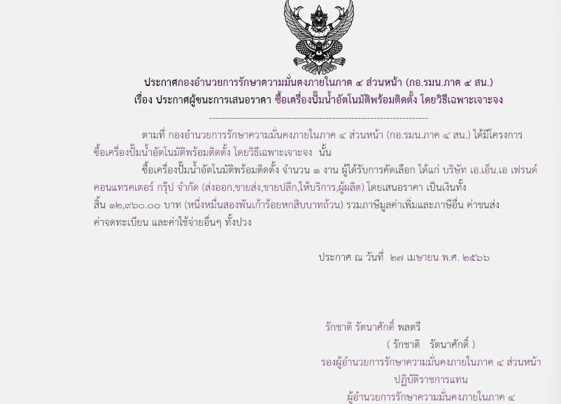 ประกาศผู้ชนะการเสนอราคา ซื้อเครื่องปั๊มน้ำอัตโนมัติพร้อมติดตั้ง โดยวิธีเฉพาะเจาะจง