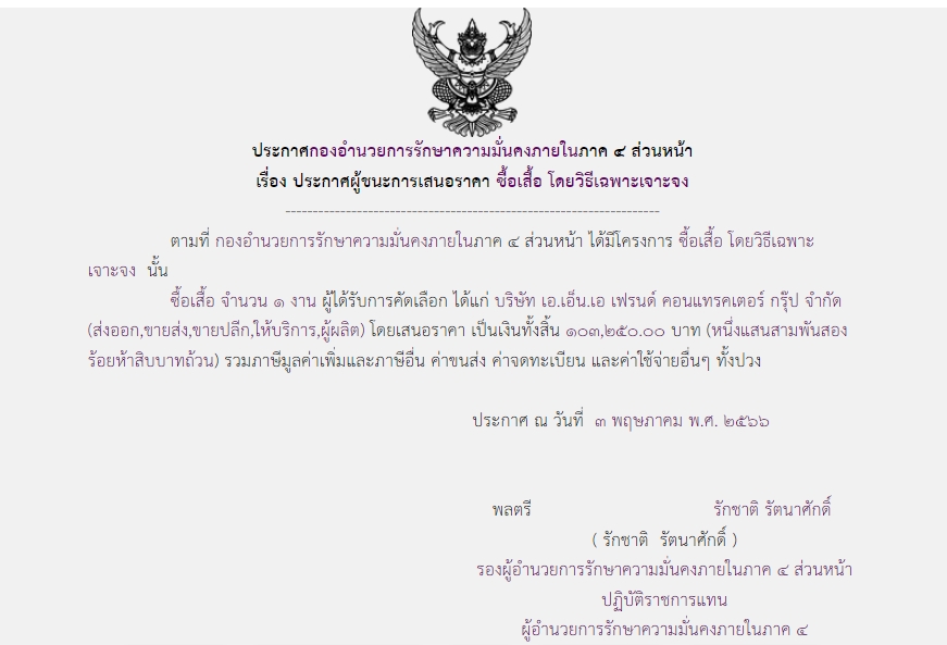 ประกาศผู้ชนะการเสนอราคา ซื้อเสื้อ โดยวิธีเฉพาะเจาะจง