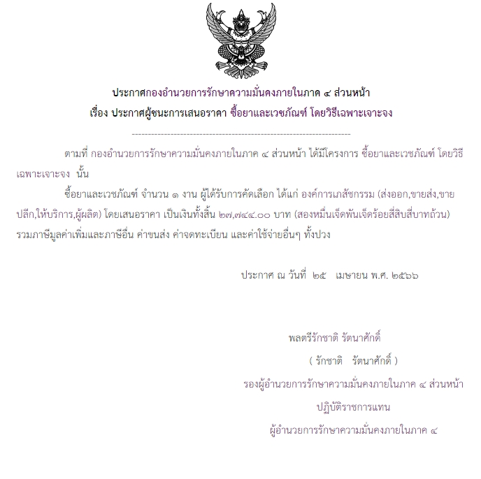 ประกาศผู้ชนะการเสนอราคา ซื้อยาและเวชภัณฑ์ โดยวิธีเฉพาะเจาะจง