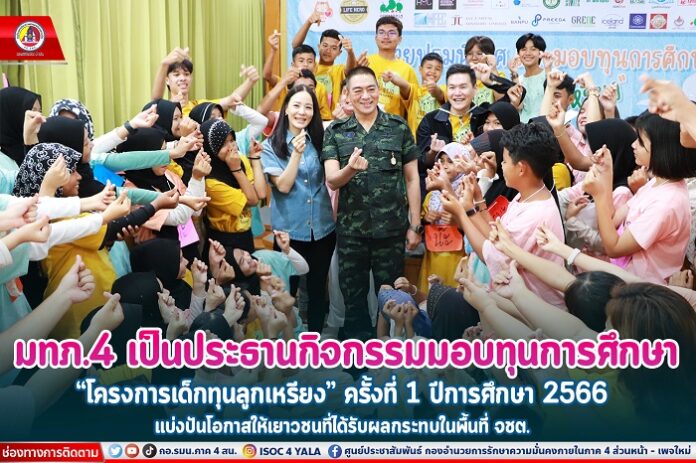 วันนี้ 27 พฤษภาคม 2566 เวลา 10.00 น. ที่ห้องประชุมค่ายพักแรมสวนสัตว์สงขลา อำเภอเมือง จังหวัดสงขลา พลโท ศานติ ศกุนตนาค แม่ทัพภาคที่ 4/ผู้อำนวยการรักษาความมั่นคงภายในภาค 4 เป็นประธานกิจกรรมมอบทุนการศึกษา “โครงการเด็กทุนลูกเหรียง” ครั้งที่ 1 ประจำปีการศึกษา 2566 โดยมี นางสาววรรณกนก เปาะอิแตดาโอะ นายกสมาคมเด็กและเยาวชนเพื่อสันติภาพชายแดนใต้ ให้การต้อนรับ พร้อมด้วย พลตรี วรเดช เดชรักษา ผู้อำนวยการศูนย์สันติวิธี กองอำนวยการรักษาความมั่นคงภายในภาค 4 ส่วนหน้า, ผู้ช่วยเลขาธิการศูนย์อำนวยการบริหารจังหวัดชายแดนภาคใต้, ผู้แทนหน่วยงานภาครัฐ, ภาคเอกชน, สมาชิกกลุ่มลูกเหรียง และเยาวชนเด็กทุนลูกเหรียง เข้าร่วมกิจกรรมอย่างพร้อมเพียง โดยมีทุนลูกเหรียงจำนวนทั้งสิ้น 66 ทุน