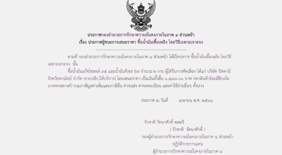 ประกาศผู้ชนะการเสนอราคา ซื้อน้ำมันเชื้อเพลิง โดยวิธีเฉพาะเจาะจง