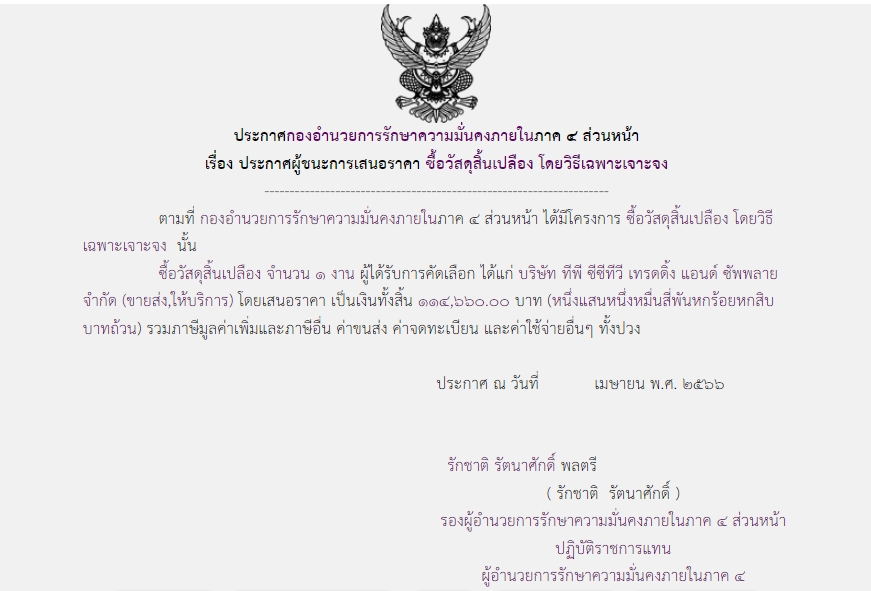 ประกาศผู้ชนะการเสนอราคา ซื้อวัสดุสิ้นเปลือง โดยวิธีเฉพาะเจาะจง