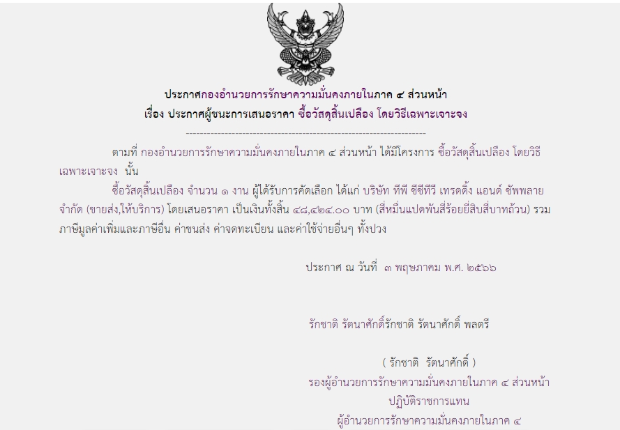 ประกาศผู้ชนะการเสนอราคา ซื้อวัสดุสิ้นเปลือง โดยวิธีเฉพาะเจาะจง