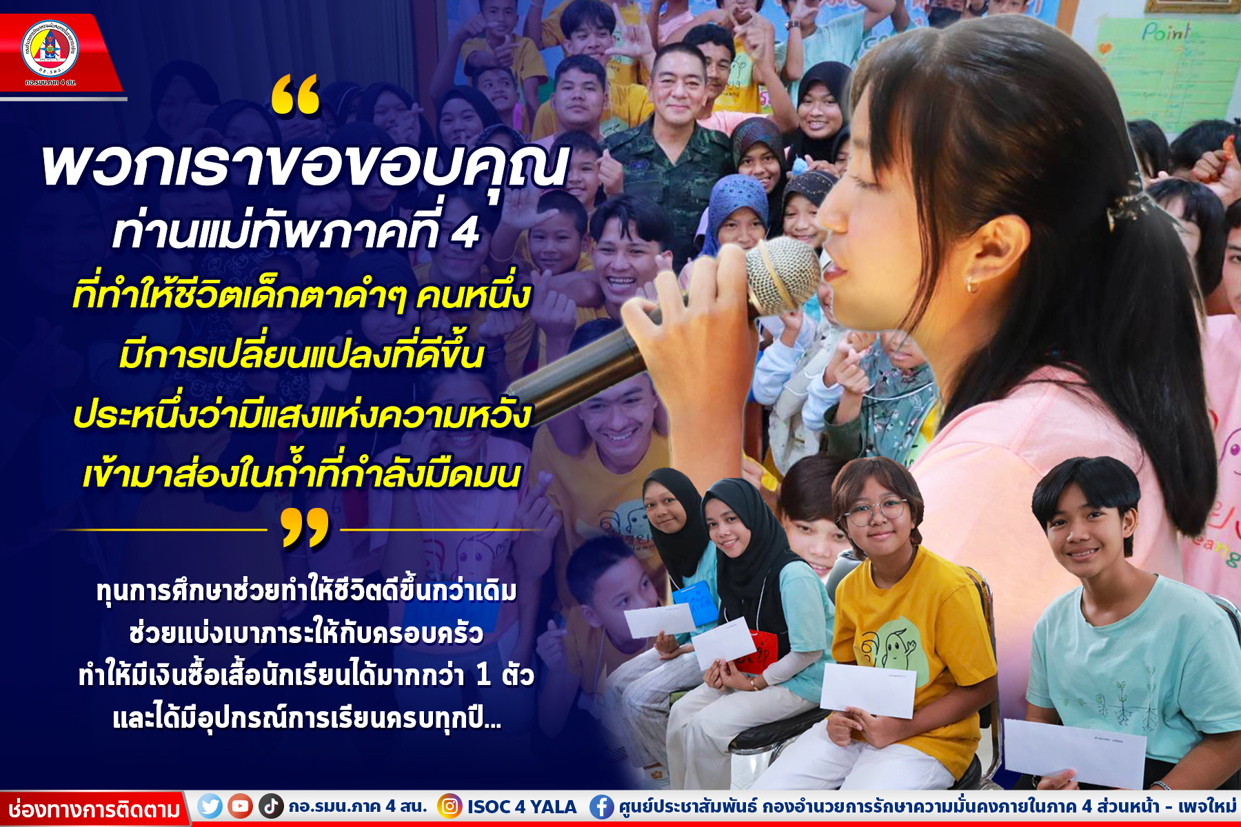 ประชาสัมพันธ์ข่าวประชาสัมพันธ์ “…พวกเราขอขอบคุณท่านแม่ทัพภาคที่ 4 ที่ทำให้ชีวิตเด็กตาดำๆ คนหนึ่ง มีการเปลี่ยนแปลงที่ดีขึ้น ประหนึ่งว่ามีแสงแห่งความหวังเข้ามาส่องในถ้ำที่กำลังมืดมน…” May 29, 2023 421 Share Facebook Twitter Google+ Telegram LINE ทุนการศึกษาช่วยทำให้ชีวิตดีขึ้นกว่าเดิม ช่วยแบ่งเบาภาระให้กับครอบครัว ทำให้มีเงินซื้อเสื้อนักเรียนได้มากกว่า 1 ตัว และได้มีอุปกรณ์การเรียนครบทุกปี… ศูนย์ประชาสัมพันธ์กองอำนวยการรักษาความมั่นคงภายในภาค4ส่วนหน้า