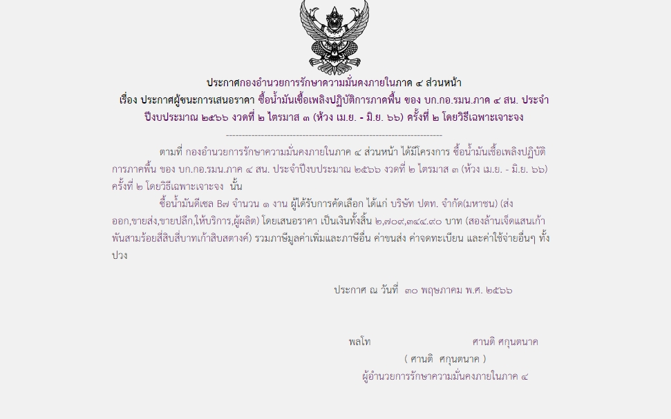 จัดซื้อ จัดจ้างประกาศผู้ชนะการเสนอราคา ประกาศผู้ชนะการเสนอราคา ซื้อน้ำมันเชื้อเพลิงปฏิบัติการภาคฟื้น ของ บก.กอ.รมน.ภาค ๔ สน. ประจำ ปิงบประมาณ ๒๕๖๖ งวดที่ ๒ ไตรมาส ๓ (ห้วง เม.ย. – มิ.ย. ๖๖) ครั้งที่ ๒ โดยวิธีเฉพาะเจาะจง May 31, 2023 372 Share Facebook Twitter Google+ Telegram LINE