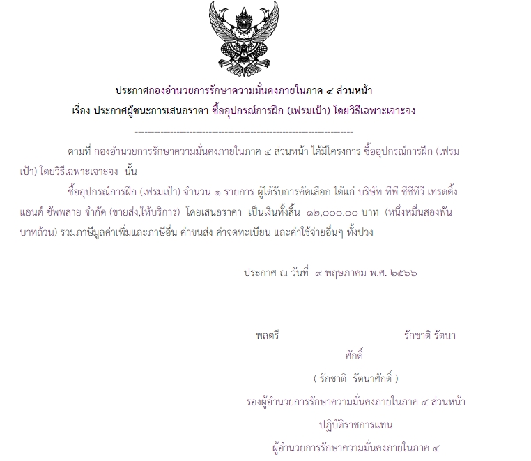 ประกาศผู้ชนะการเสนอราคา ซื้ออุปกรณ์การฝึก (เฟรมเป้า) โดยวิธีเฉพาะเจาะจง