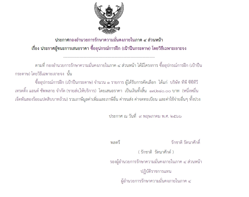 ประกาศผู้ชนะการเสนอราคา ซื้ออุปกรณ์การฝึก (เป้าปืนกระดาษ) โดยวิธีเฉพาะเจาะจง