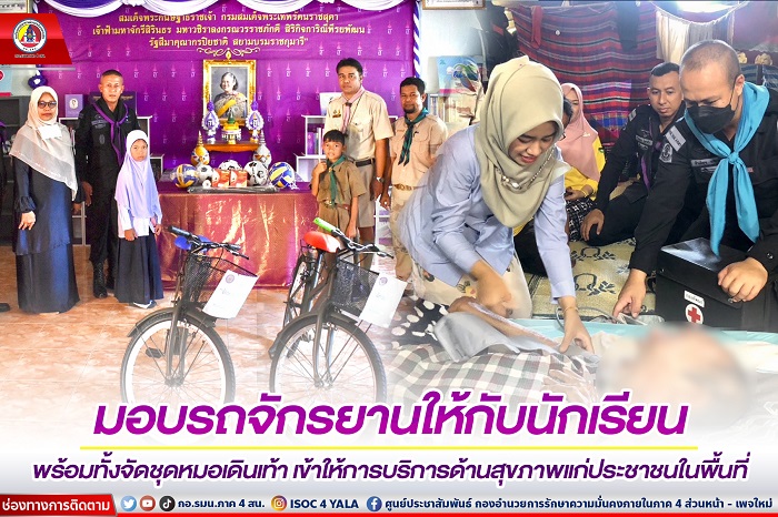 พันเอก ภาคภูมิ จันทรักษ์ ผู้บังคับหน่วยเฉพาะกิจกรมทหารพรานที่ 44 ลงพื้นที่ไปยังโรงเรียนชุมชนบ้านบางเก่า ตำบลบางเก่า และ โรงเรียนศาสน์อิสลามกะลาพอ ตำบลเตราะบอน อำเภอสายบุรี จังหวัดปัตตานี เพื่อพบปะพูดคุย พัฒนาสัมพันธ์กับบุคลากรทางการศึกษา และได้มอบรถจักรยานจาก โครงการ “จักรยาน สานฝัน ปันสุข” ให้กับนักเรียนที่มีผลการเรียนดี แต่ขาดแคลนทุนทรัพย์ และมีภูมิลำเนาอยู่ในพื้นที่ห่างไกลได้มีรถจักรยานเพื่อปั่นไปโรงเรียน โดยหน่วยได้ดำเนินการนำรถจักรยาน (เก่า) ที่ชำรุดทรุดโทรม มาปรับปรุงซ่อมแซมให้สามารถนำกลับมาใช้งานได้ เพื่อนำไปมอบให้กับนักเรียน นอกจากนี้ ผู้บังคับหน่วยเฉพาะกิจกรมทหารพรานที่ 44 ยังได้มอบอุปกรณ์กีฬา และข้าวสาร ให้กับสถานศึกษาในสังกัดของโรงเรียนพระราชูปถัมภ์ สมเด็จพระกนิษฐาธิราชเจ้า กรมสมเด็จพระเทพรัตนราชสุดาฯ สยามบรมราชกุมารี เพื่อนำไปให้นักเรียนได้นำไปใช้ในการออกกำลังกาย