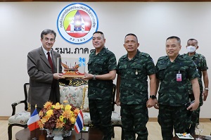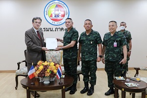เมื่อวันที่ 1 มิถุนายน 2566 เวลา 11.00 น. ที่ห้องรับรอง กองอำนวยการรักษาความมั่นคงภายในภาค 4 ส่วนหน้า ค่ายสิรินธร ตำบลเขาตูม อำเภอยะรัง จังหวัดปัตตานี พลโท ศานติ ศกุนตนาค แม่ทัพภาคที่ 4 / ผู้อำนวยการรักษาความมั่นคงภายในภาค 4 พร้อมด้วย พลตรี ปราโมทย์ พรหมอินทร์ รองแม่ทัพภาคที่ 4 / รองผู้อำนวยการรักษาความมั่นคงภายในภาค 4 ส่วนหน้า และคณะ ต้อนรับนายตีแยรี มาตู (Thierry Mathou) เอกอัครราชทูตสาธารณรัฐฝรั่งเศสประจำประเทศไทย , นายเซบาสเตียง เดอโวฌานี (Sebastien de VAUJANY ) เลขานุการเอกอัครราชทูตสาธารณรัฐฝรั่งเศสประจำประเทศไทย , นายอูแบร์ โกลารีส (Hubert COLARIS) ที่ปรึกษาด้านเศรษฐกิจและการค้า , นายซาวิเย่ร์ โกรแมทร์ (Xavnier GROSMAITRE) ผู้ช่วยทูตฝ่ายความร่วมมือด้านวิทยาศาสตร์และอุดมศึกษา , จ่าสิบเอก อเล็กซิส เฮิร์ตซิก หัวหน้าหน่วยปฏิบัติการด้านความมั่นคง ในโอกาสเข้าพบแม่ทัพภาคที่ 4 เพื่อรับทราบข้อมูลสถานการณ์ความมั่นคงในพื้นที่จังหวัดชายแดนภาคใต้ ตลอดจนหารือแนวทางการส่งเสริมความร่วมมือด้านต่าง ๆ ระหว่างกัน
