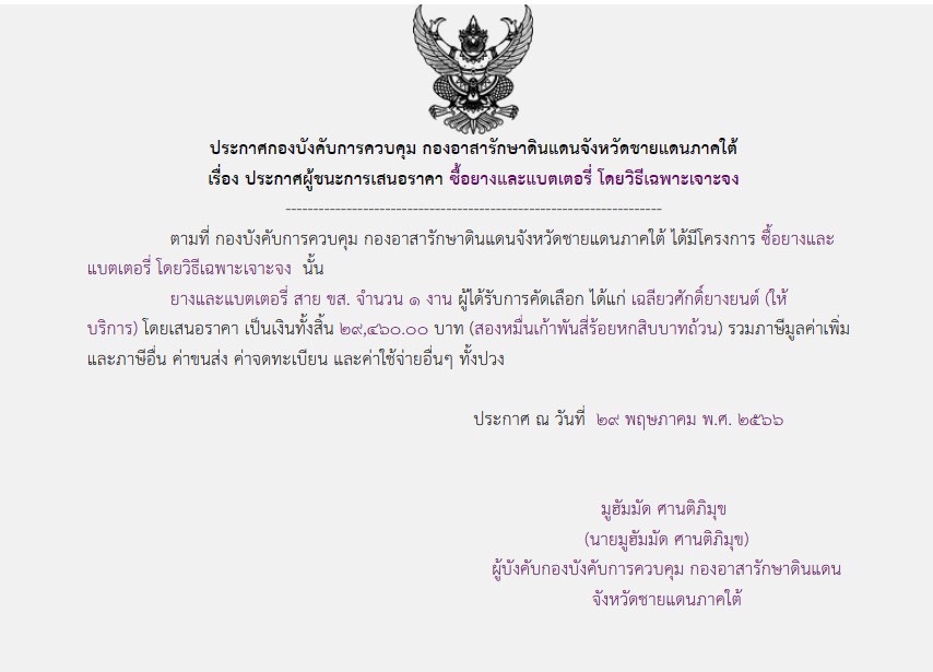 ประกาศผู้ชนะการเสนอราคา ซื้อยางและแบตเตอรี่ โดยวิธีเฉพาะเจาะจง