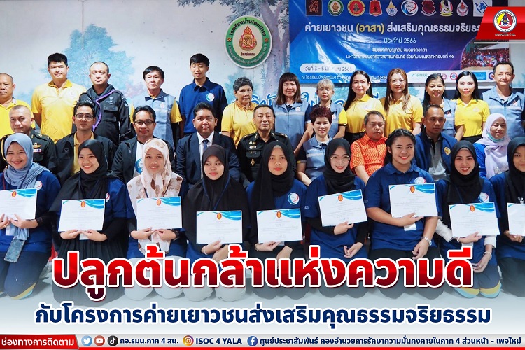 พลตรี ขจรศักดิ์ อินทร์ทอง ผู้บัญชาการมณฑลทหารบกที่ 46 เป็นประธานในพิธีปิดโครงการค่ายเยาวชนส่งเสริมคุณธรรมจริยธรรม ประจำปี 2566 ซึ่งมณฑลทหารบกที่ 46 ร่วมกับ มหาวิทยาลัยนราธิวาสราชนครินทร์พร้อมภาคีเครือข่าย 5 สถาบันอุดมศึกษาในพื้นที่จังหวัดชายแดนภาคใต้ ร่วมกันจัดขึ้น เพื่อสร้างภูมคุ้มกันให้กับเยาวชน ในการดำรงชีวิต และสามารถที่จะแก้ไขปัญหาต่าง ๆ ในสังคมได้อย่างมีสติ เป็นกำลังสำคัญในการพัฒนาประเทศให้เจริญก้าวหน้า ทั้งทางด้านเศรษฐกิจ สัมคม และความมั่งคงของชาติในอนาคต และเป็นการปลูกฝังอุดมการณ์ความรัก ชาติ ศาสนา และพระมหากษัตริย์ ตลอดจนได้แบ่งปัน และเรียนรู้การแบ่งปันและพึ่งพาในสังคมพหุวัฒนธรรมอย่างยั่งยืน โดยมีกำหนดการจัดกิจกรรมห้วงวันที่ 3 – 5 มิถุนายน 2566 ณ โรงเรียนบ้านโคกนิบง ตำบลไทรทอง อำเภอไม้แก่น จังหวัดปัตตานี