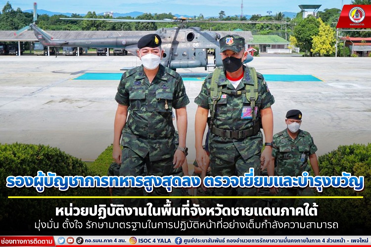 วันนี้ (6 พฤษภาคม 2566) เวลา 10.00 น. ที่ห้องประชุม 1 กองอำนวยการรักษาความมั่นคงภายในภาค 4 ส่วนหน้า ค่ายสิรินธร ตำบลเขาตูม อำเภอยะรัง จังหวัดปัตตานี พลเอก ทรงวิทย์ หนุนภักดี รองผู้บัญชาการทหารสูงสุด / รองผู้บัญชาการศูนย์บัญชาการทางทหาร กองบัญชาการกองทัพไทย และคณะ เดินทางลงพื้นที่จังหวัดชายแดนภาคใต้ เพื่อตรวจเยี่ยมให้โอวาท มอบขวัญและกำลังใจแก่กำลังพลผู้ปฏิบัติงานในพื้นที่จังหวัดชายแดนภาคใต้ โดยมี พลโท ศานติ ศกุนตนาค แม่ทัพภาคที่ 4 / ผู้อำนวยการรักษาความมั่นคงภายในภาค 4 พร้อมด้วยหน่วยขึ้นตรงกองอำนวยการรักษาความมั่นคงภายในภาย 4 ส่วนหน้าให้การต้อนรับและเข้าร่วมประชุมอย่างพร้อมเพรียง