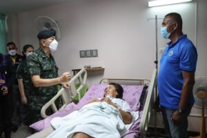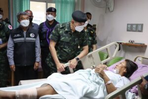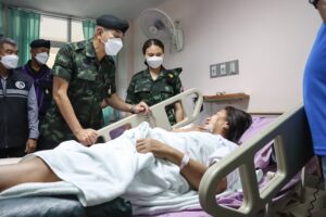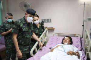 วันนี้ (7 มิถุนายน 2566) เวลา 16.15 น. ที่ห้อง 207 ชั้น 2 ตึกชูเกียรติ ปิติเจริญกิจ โรงพยาบาลปัตตานี อำเมือง จังหวัดปัตตานี พลโท ศานติ ศกุนตนาค แม่ทัพภาคที่ 4 / ผู้อำนวยการรักษาความมั่นคงภายในภาค 4 พร้อมด้วย พลตรี ขจรศักดิ์ อินทร์ทอง ผู้บัญชาการมณฑลทหารบกที่ 46 เยี่ยมให้กำลังใจ ร้อยเอก สมชัย ศรีพรหม อายุ 53 ปี เจ้าหน้าที่ทหารพรานกรมทหารพรานที่ 44 และ นางสาวสุรีพร ทาหนองบัว อายุ 53 ปี (ภรรยา) ได้รับบาดเจ็บจากเหตุคนร้ายลอบวางระเบิด เมื่อวันที่ 5 มิถุนายน 2566 เวลา 00.45 น. ที่บริเวณ บ้านบน หมู่ 2 ตำบลปะเสยะวอ อำเภอสายบุรี จังหวัดปัตตานี โดยทั้งคู่ถูกสะเก็ดระเบิดเข้าที่บริเวณลำตัว ได้รับบาดเจ็บ ขณะนี้อาการปลอดภัยแล้ว โดยมี พันเอก ภาคภูมิ จันทรักษ์ ผู้บังคับหน่วยเฉพาะกิจกรมทหารพรานที่ 44, นายสนั่น สนธิเมือง รองผู้ว่าราชการจังหวัดปัตตานี, แพทย์และเจ้าหน้าที่พยาบาล ร่วมให้การต้อนรับ