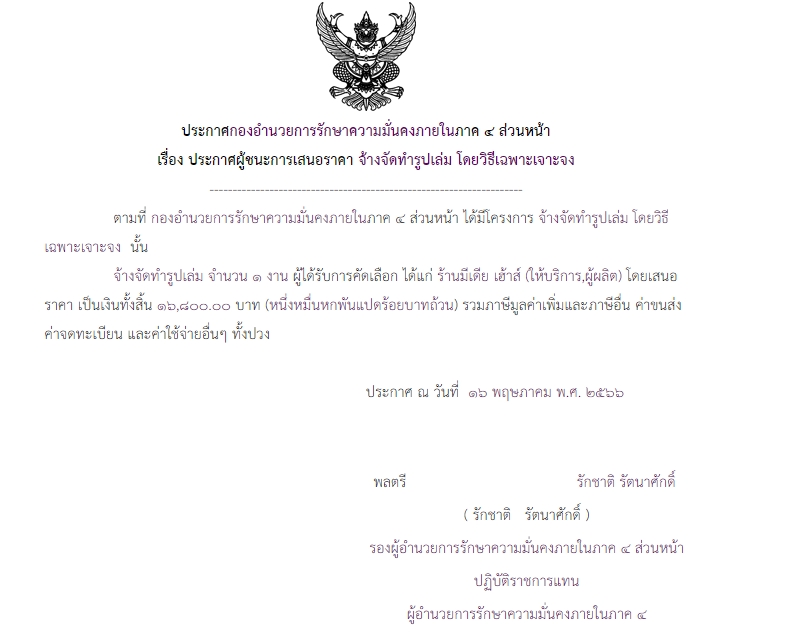 ประกาศผู้ชนะการเสนอราคา จ้างจัดทำรูปเล่ม โดยวิธีเฉพาะเจาะจง