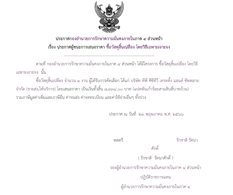 ประกาศผู้ชนะการเสนอราคา ซื้อวัสดุสิ้นเปลือง โดยวิธีเฉพาะเจาะจง