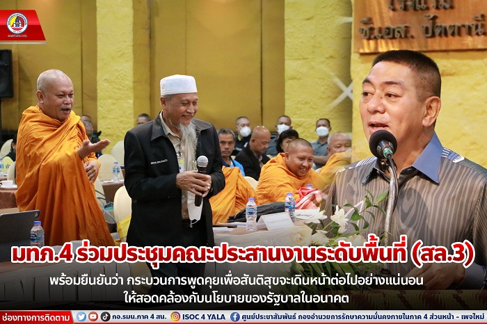 แม่ทัพภาคที่ 4 ในฐานะหัวหน้าคณะประสานงานระดับพื้นที่ กล่าวว่า การขับเคลื่อนในคณะสล. 3 ยังคงเดินหน้าขับเคลื่อนต่อไป ให้สอดคล้องกับนโยบายของรัฐบาลใหม่ คาดว่าไม่แตกต่างจากนโยบายเดิมที่เป็นยุทธศาสตร์เดิมที่ทำอยู่ นั่นคือการดูแลความปลอดภัยในชีวิตและทรัพย์สินของประชาชน ซึ่งเรามีจุดยืนการปฏิบัติงานที่ชัดเจน ไม่ว่ารัฐบาลไหน ช่วงการเปลี่ยนผ่านของรัฐบาลในขณะนี้ เราก็พร้อมที่จะให้คำแนะนำ ให้ข้อมูลกับทุกฝ่าย ประชาชนเองก็พร้อมที่จะให้การสนับสนุนเพื่อเกิดความสันติสุขในพื้นที่ ส่วนประเด็นการจัดตั้งรัฐบาลใหม่ และอาจจะมีผลกระทบต่อการปรับโครงสร้างการปฏิบัติงาน ไม่ได้มีความกังวลแต่อย่างใด เพราะเราพร้อมที่จะตอบคำถามกับทุกภาคส่วนว่า ทำไมจังหวัดชายแดนภาคใต้ยังต้องการการดูแลรักษาความปลอดภัยจากเจ้าหน้าที่ทหารอยู่ และในวันนี้ก็จะได้นำคำแนะนำ ข้อเสนอแนะจากทุกภาคส่วนไปแก้ไข ปรับปรุงการทำงานดูแลกลุ่มเปราะบาง ผู้นำศาสนา หรือการเพิ่มประสิทธิภาพการป้องกันเหตุความรุนแรงในพื้นที่ และที่สำคัญคือการอยากให้ประชาชนทุกคนในพื้นที่ ได้รับทราบข้อมูล ทุกข้อสรุปของการประชุมหารือ ให้พร้อมเดินหน้า นำไปสู่การหาทางออกของปัญหาที่เกิดขึ้นในพื้นที่จังหวัดชายแดนภาคใต้ ตลอดจนเป็นการขับเคลื่อนงาน การสร้างสภาวะแวดล้อมที่เอื้อต่อการพูดคุยสันติสุขต่อไป