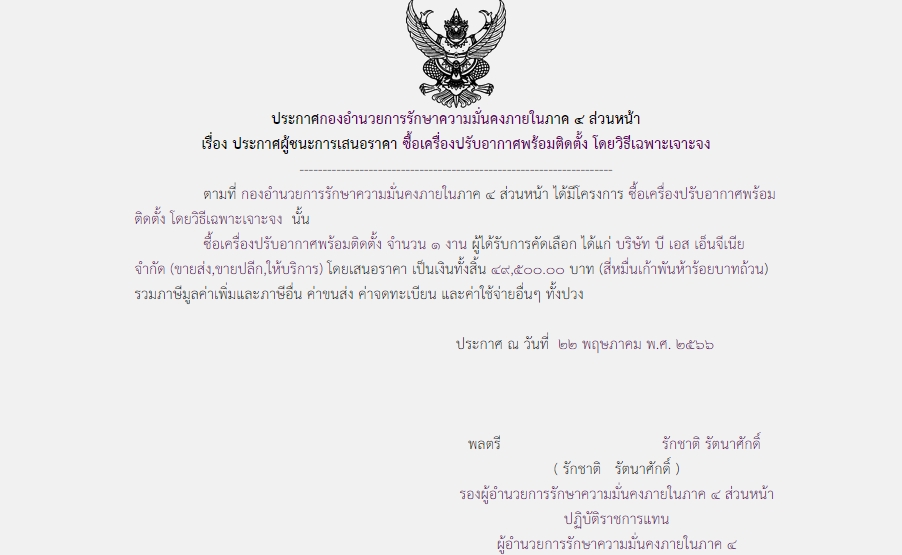 ประกาศผู้ชนะการเสนอราคา ซื้อเครื่องปรับอากาศพร้อมติดตั้ง โดยวิธีเฉพาะเจาะจง